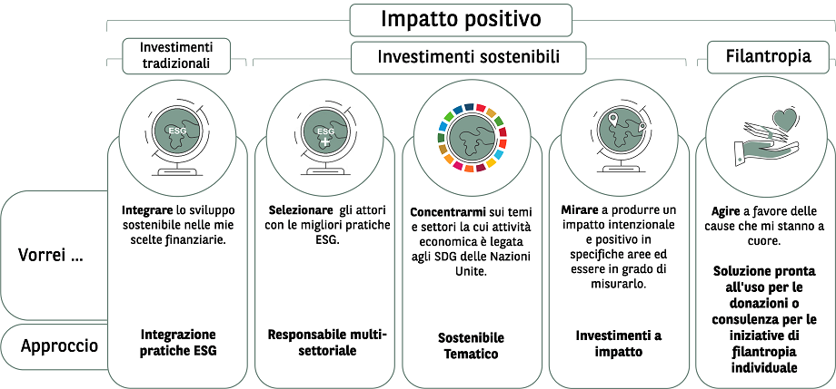 Con My Impact avrà la possibilità di conoscere il suo profilo “Investitore” e/o “Filantropo” ed identificare le sue preferenze in materia di investimenti sostenibili.